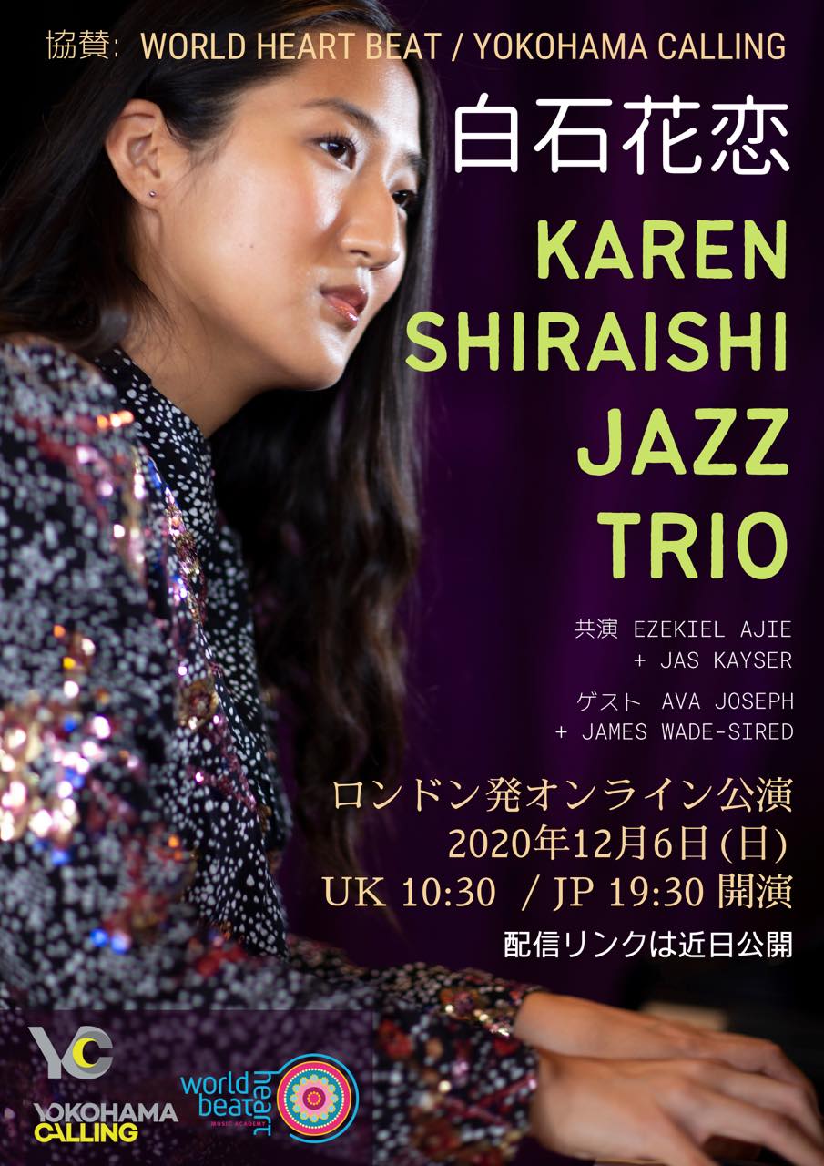 作曲やアレンジなど幅広く手がける花恋さんが、来月12月6日(日)にワールド・ハートビート音楽アカデミーと、日英の音楽家を繋げるプロデューサー機関であるYokohama Callingの協賛を得て、「Karen Shiraishi Jazz Trio」としてオンライン公演を開催する。共演は才能あるアカデミーや大学の仲間たちなので、息のあった演奏を見せてくれるだろう。