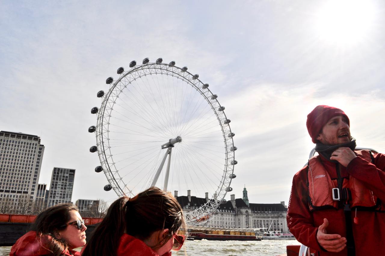アクション映画でボートのチェイス・シーンとかありますでしょ? 007のような。まさにあれと同じ。エンジンの爆音と、気分を盛り上げるポップ・ミュージック。テムズの岸辺を彩る数々の歴史的な建物を眺めつつ、スリルとスピードをめいっぱい楽しみます!(グリッドを握りしめているため、絶叫&爆走中の写真はありません)