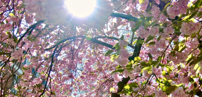 八重桜は満開をちょっとだけ過ぎたところで、ほどよい塩梅のそよ風に吹かれ、気持ち良さそうに花びらを飛ばしていました。お日様の様子も麗しく、キラキラと光が差し込む光景はまるで、楽園のようでした。
