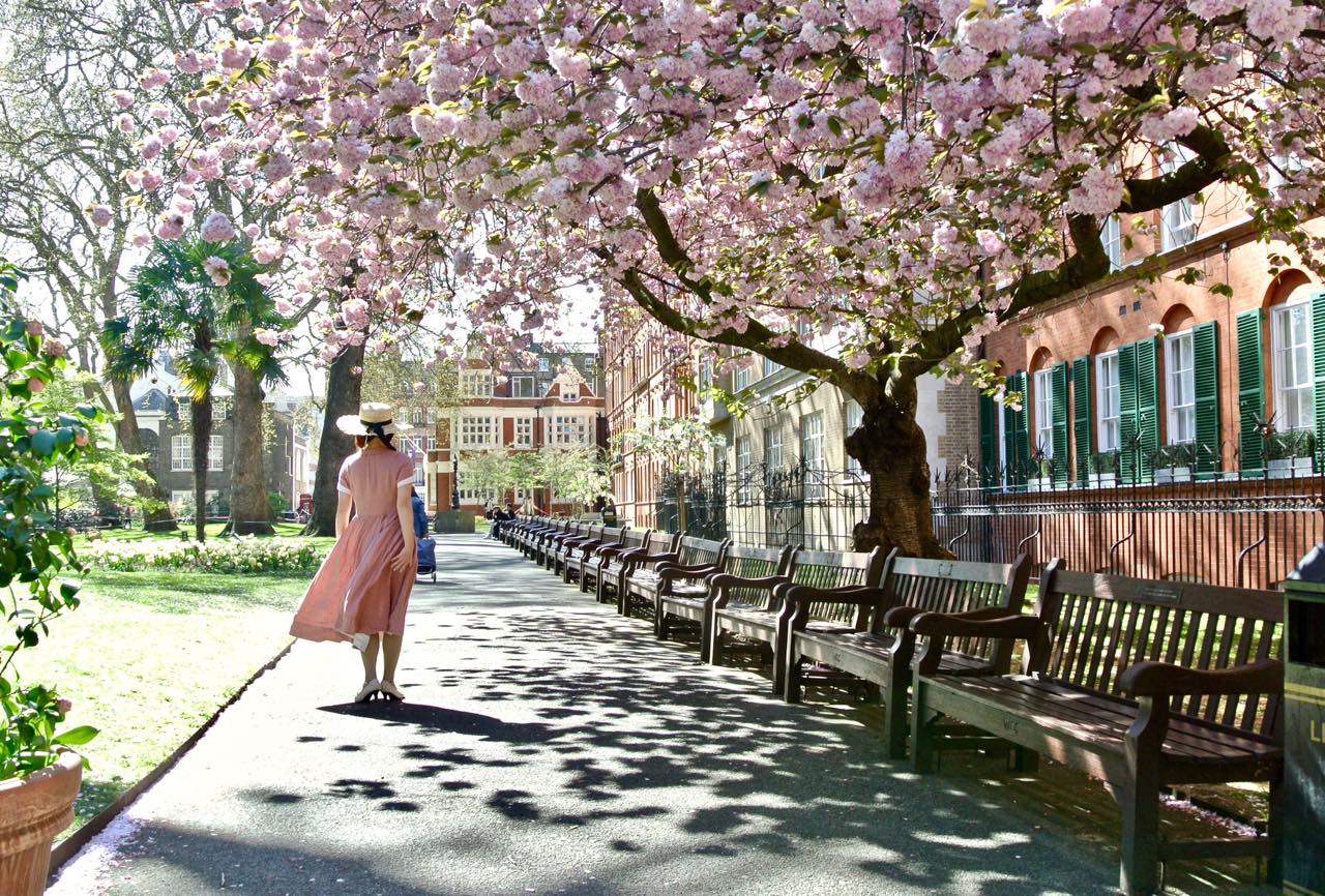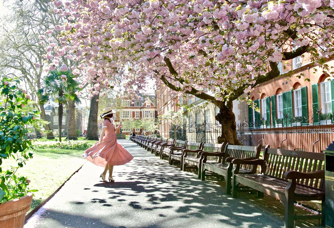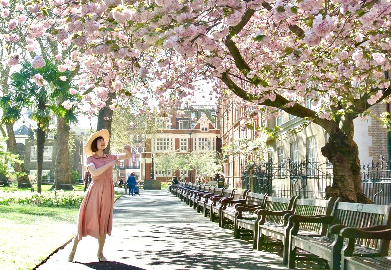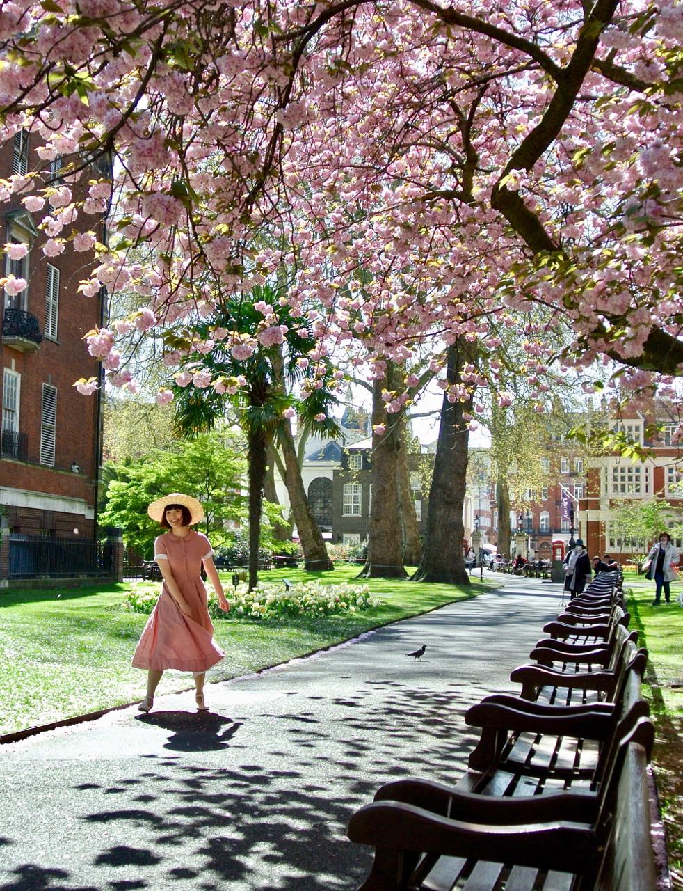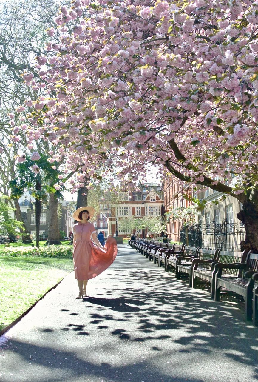 この大きな八重桜の下で繰り広げられたランウェイ・シーンは、それはそれはキュートで美しいものでした。午後の少し遅い時間だったからか、人通りも次第にまばらになり、赤煉瓦の建物の前でイギリスらしい木のベンチが整列している様子も、なかなかの見ものでした。