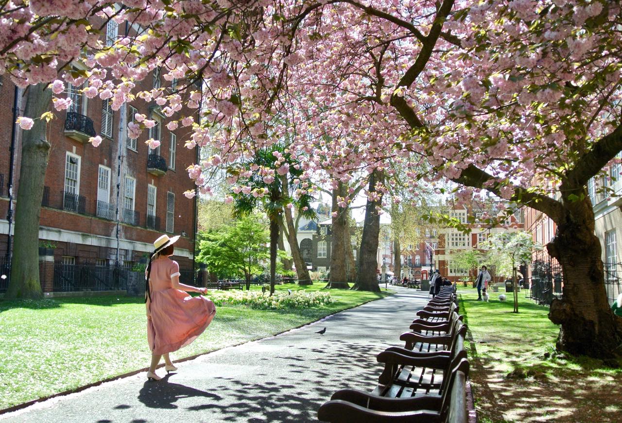 高級なブティックやレストランが並ぶMount Streetの裏手にひっそりと存在するので、ある意味、知る人ぞ知るオアシス。ロンドナーたちの憩いの場です。そこに、この大きな八重桜が佇んでいるのです。