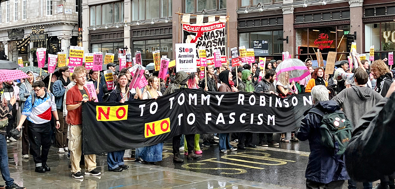 ロンドン中心部で今年9月にあった極右勢力による移民反対デモに反対する人たち。