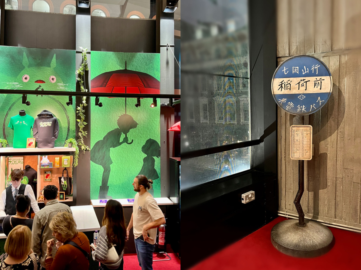 シアター内にはサツキとメイがトトロと一緒にバスを待つときのバス停をはじめ、撮影スポットあり。グッズ販売も大盛況!