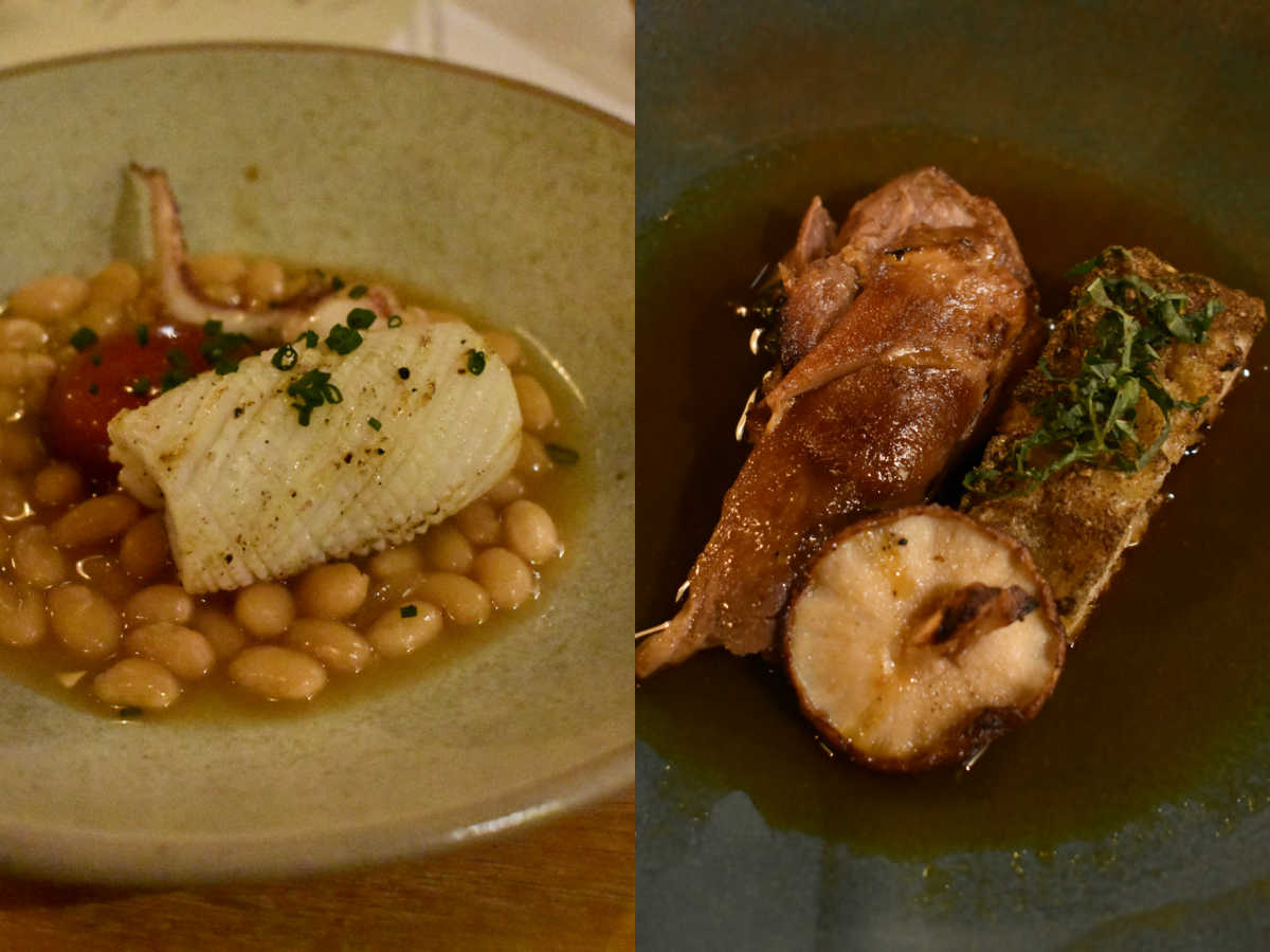 イカは繊細な鹿の子切り。ハリコット・ビーンズ、お醤油でキュアした卵黄を添えて(でも卵黄はお醤油でキュアせずに、そのままいただきたい塩加減)。ソースはほんのり味噌風味。右は優しく上品な味の照り焼き風ソースでいただくラム肉と椎茸、トーストしたザフタルパンを添えて。