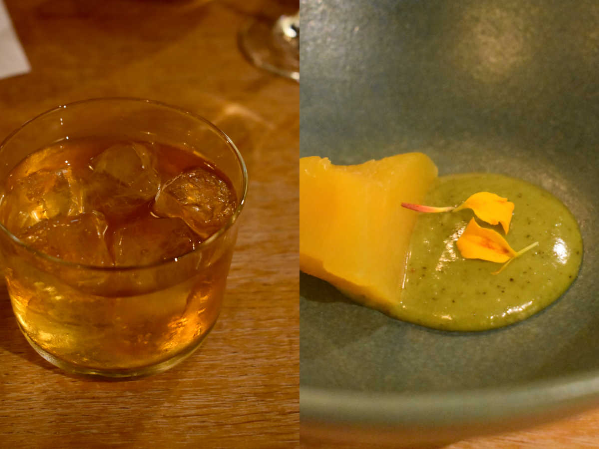 デザートはピスタチオと抹茶のソースでいただくパンプキン。皮が少し厚かったけど美味しい! 左はペアリングの「オールド・ファッションド」。