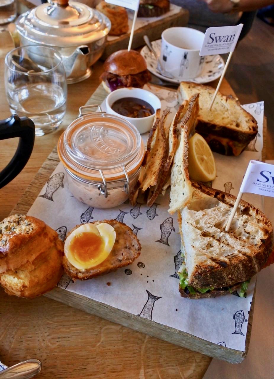 ボリュームたっぷりのフィッシュフィンガー・サンドイッチ(!)、プルド・ビーフのスライダー、ブラック・プディング入りスコッチエッグ、クロックムッシュ、ポテッド・サーモン・リエット、スティルトン・チーズ・スコーンなどなど、夢のセイボリー・スナックが勢ぞろいです♡