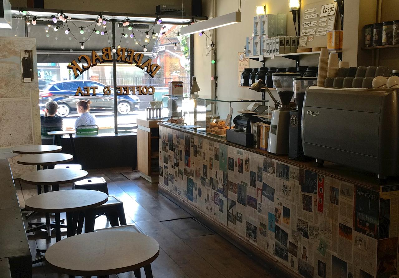 ちょっとした用事で訪れたSouth Ealingで見つけた、驚くべきハイクオリティなコーヒーショップ。おそらくスマートフォン文化にアンチを唱えるオーナーさんが、読書とカフェ文化というクラシックな組み合わせを復活させようとのコンセプトで立ち上げたのでしょう。店頭で古本を販売しているほか、カウンター周りも紙のチラシや雑誌のページで埋め尽くされ、レトロな内装とあいまって上質独立カフェの風情を醸していました。