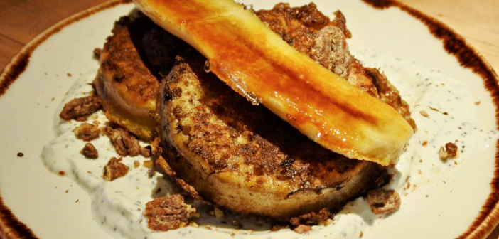 シナモン風味でフレンチ・トースト風に焼いたクランペットに、ヴァニラ風味のグリーク・ヨーグルトとキャラメライズしたバナナが添えてある一品。これは芸術的に素晴らしいメニューで、ベーコンを加えることもできますが・・・甘党ならこのままでまずはお味見を♡ クランペットのもっちりとした歯ごたえとバナナの甘み、シナモンの香りが絶妙。連れと一つずつ分け分けしましたが、もちろん一皿ぜんぶでもペロリといけます!