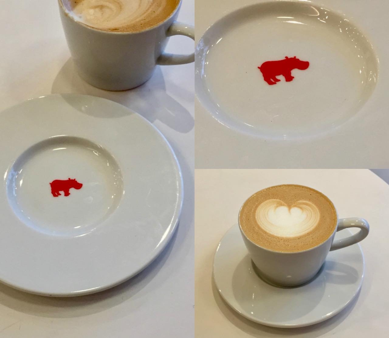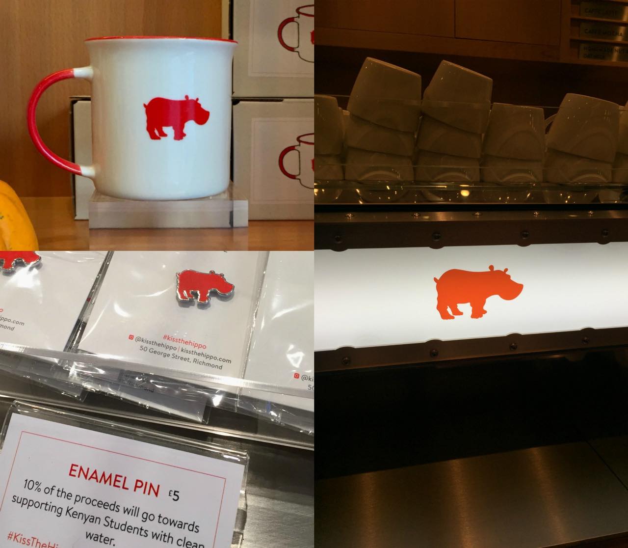 ヒポ・カップは12ポンド。ギフトにお一ついかが? 左下は収益が生産国に還元されるピンバッジ。エスプレッソ・マシーンにもヒポが!w