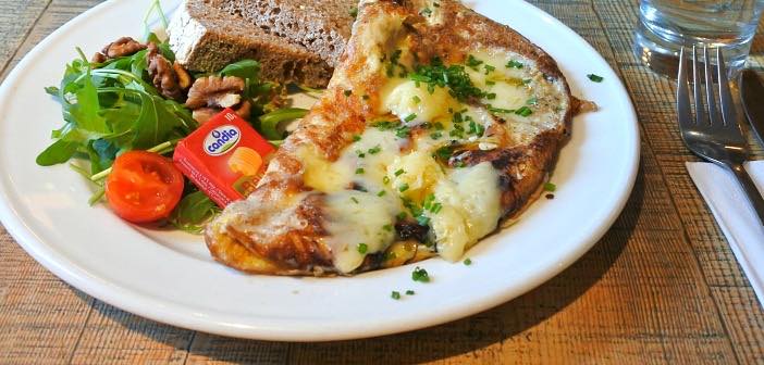 週末ブランチのチーズ・オムレツ。フランス風のふわふわオムレツが好きな方にはオススメしませんが、これはこれでオフクロの味なのかなと^^