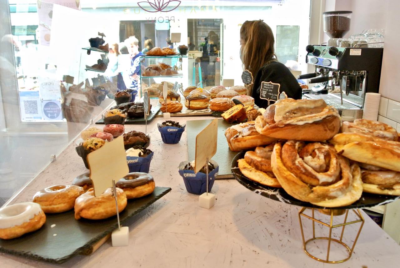 薄いグリーンとピンクを基調としたインテリアに惹かれて中に入ると、まず目に入ってくるのがたっくさんのパンやケーキたち♡  どれも素朴なタイプで、ロンドナー好みのトレンドを押さえた品々が並びます。そしてよく目を凝らしてみると・・・シュミットやバクラヴァなど、トルコ系のパンやお菓子が混ざっているので、ここが中東系オーナーさんだということがわかります。