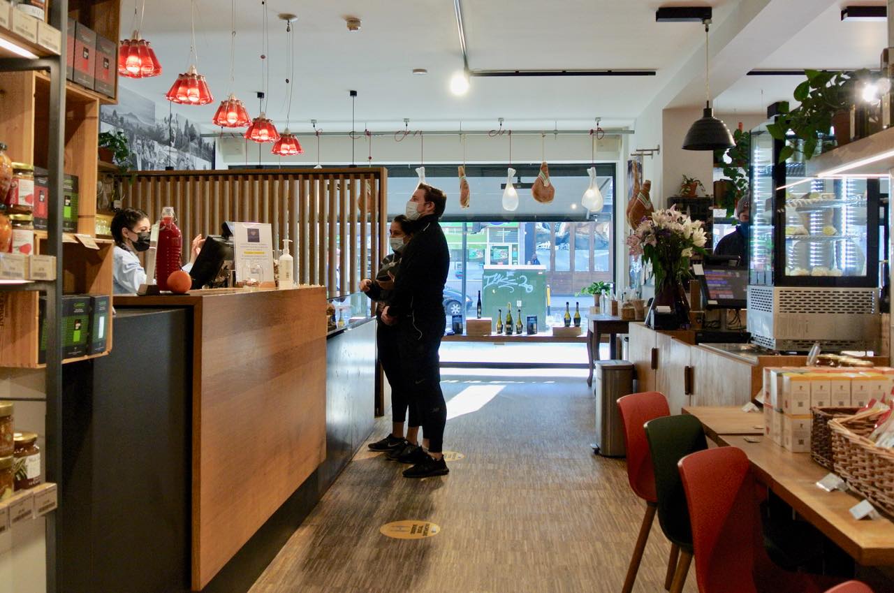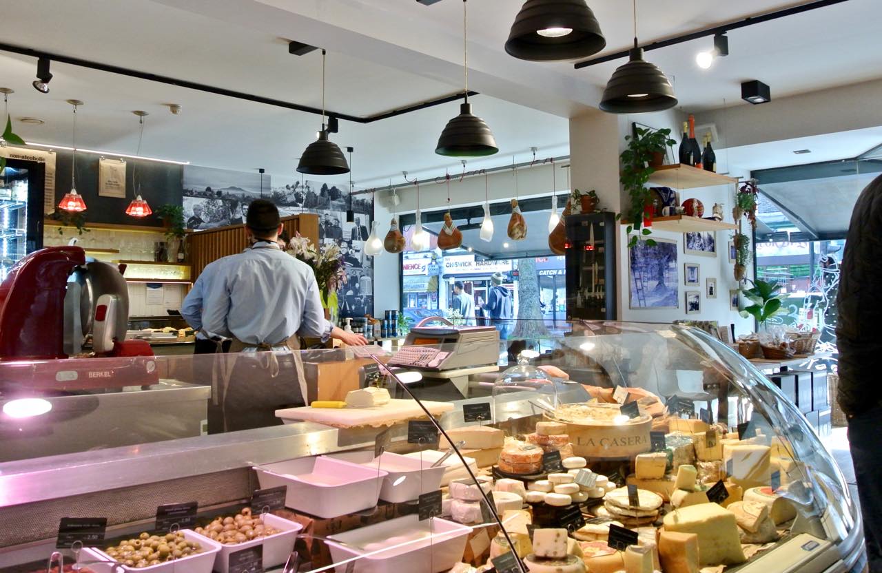 ロックダウン中はこのお店に癒された南西ロンドナーも多かったのではないでしょうか。外から見るとカジュアルなロゴに気安さを感じるのですが、中に入ってあっと驚く本物感。町の小売店としては圧倒されるような大きな冷蔵ショーケースの中に50種類以上のチーズ、30種類以上のハムやサラミが美しく陳列されています。