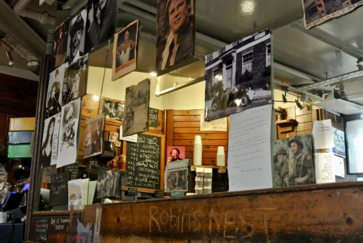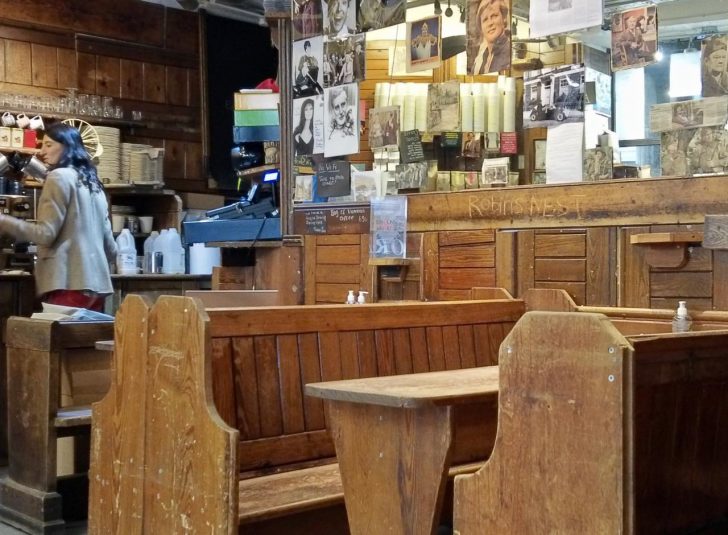 インテリアはとってもウッディで、居心地良さは抜群。加えてところ狭しと貼られた60年代や70年代のポスターや切り抜きが当店のパーソナリティーを反映しています。古い教会ベンチが修道院のような独特の趣を・・・というのは言い過ぎですが、オーナーさんのはっきりとした好みが見え隠れし、なかなか興味深い空間。