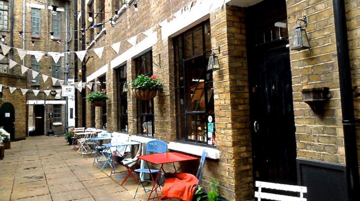 Clerkenwell Roadの大通り沿いから一本裏に入った通りの、そのまた奥にあるコートヤード内にあり、「隠れ家」という形容詞がこれほどぴったりくるカフェもありません。といっても近くに行くと看板が出ているのでご安心を♪