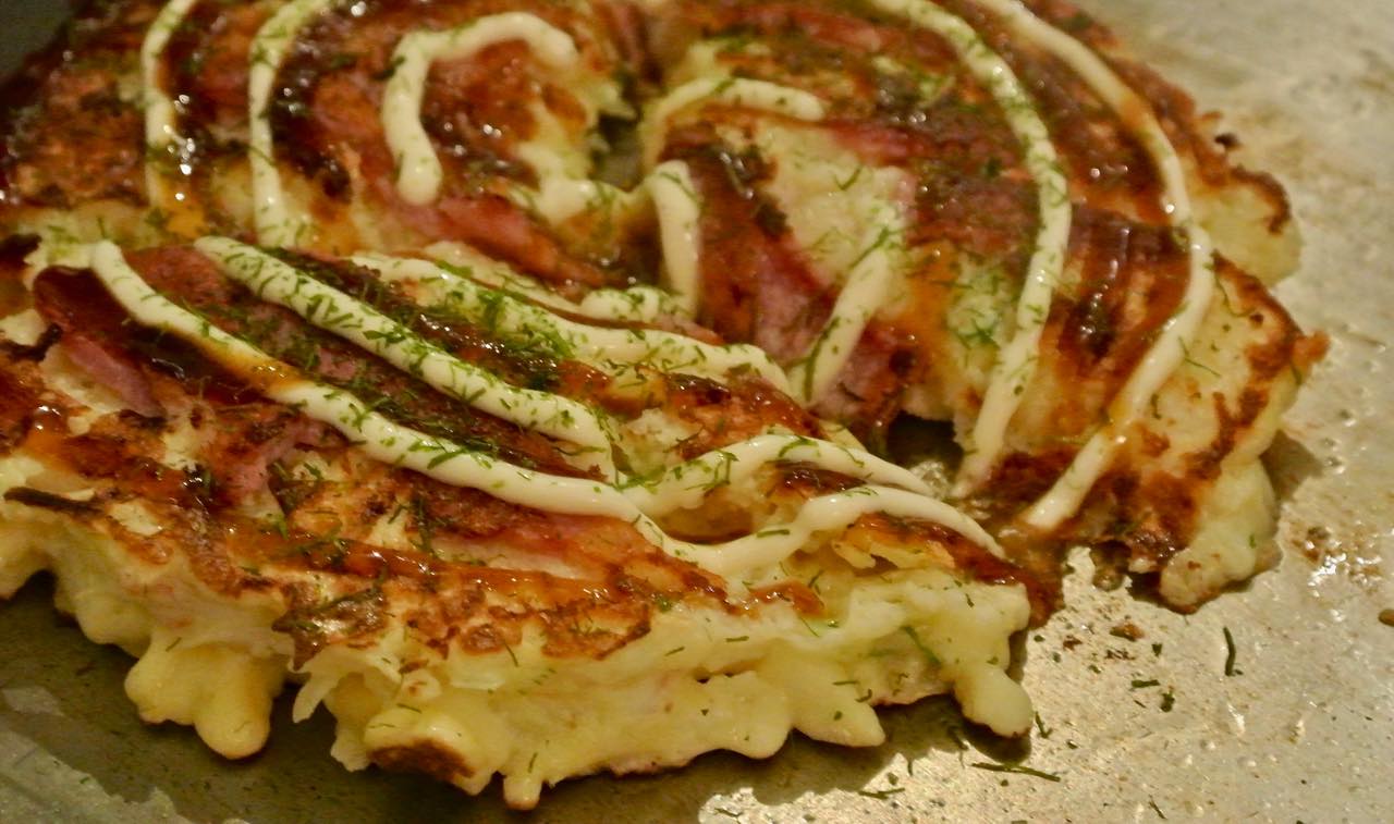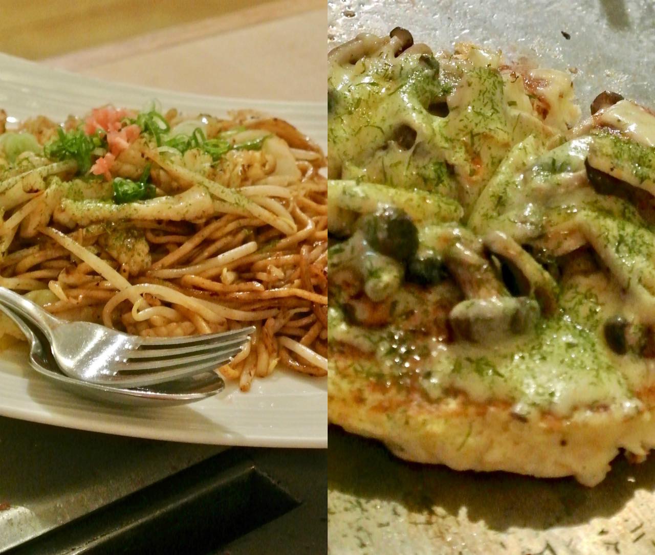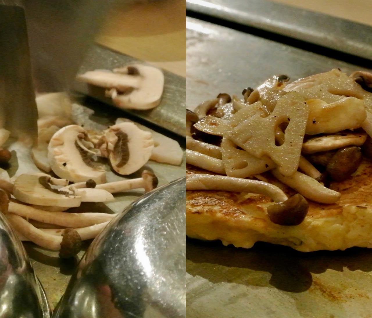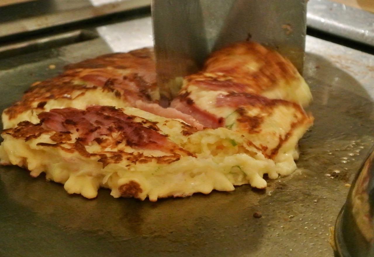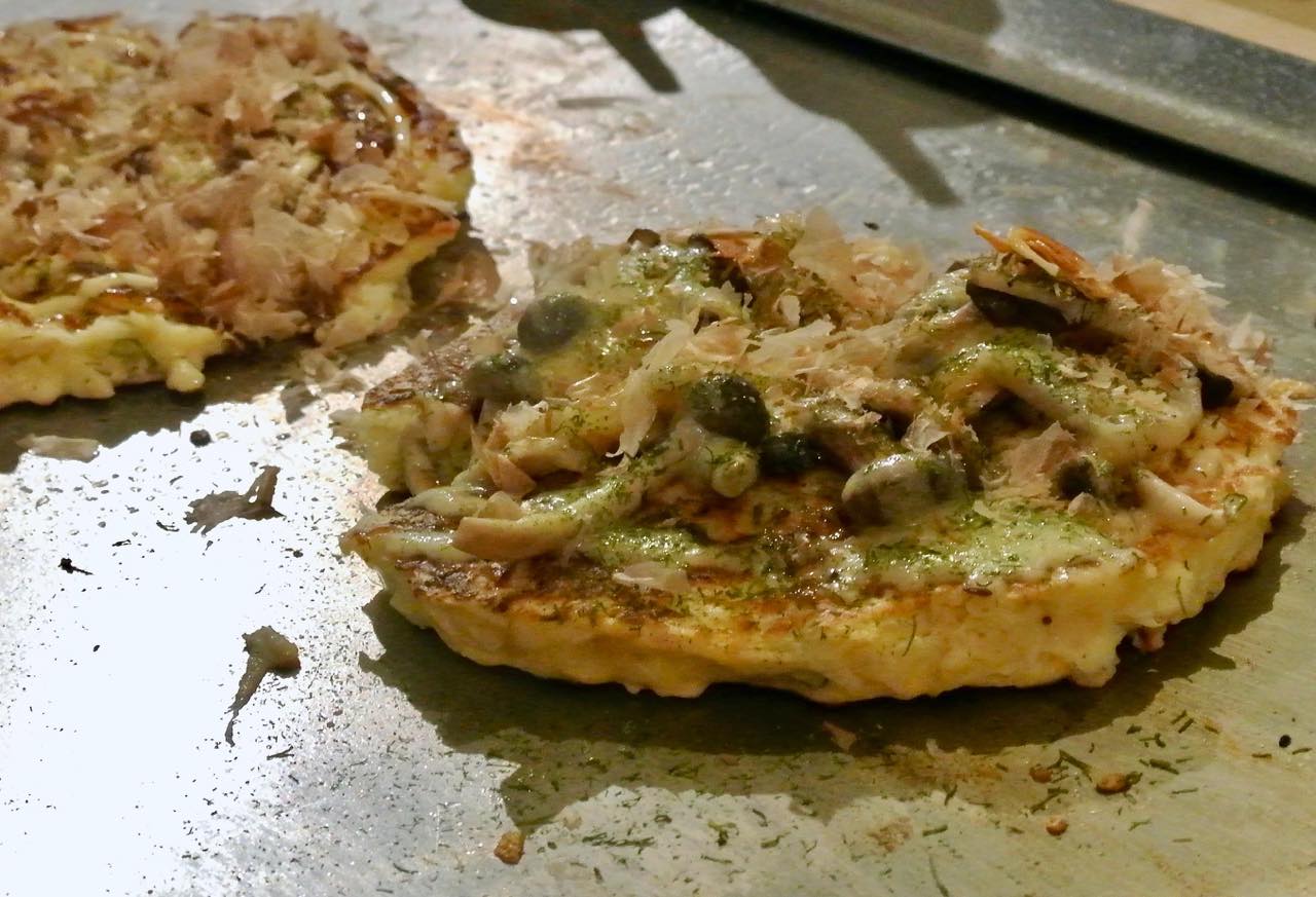 さて、お好み焼きです!♡ 日本で今、どんな焼き方が主流なのか知らないのですが ^^; やはりAbenoでは目の前でプロの方が焼いてくださるのがいい!(これがおそらくクオリティ管理の秘訣なのでしょう) そして食材の組み合わせが無限にあるのも嬉しい〜。この日は納豆+イカ、キノコ+レンコン+ポーク+チーズのような素敵なコンビネーションで焼いていただきました♡