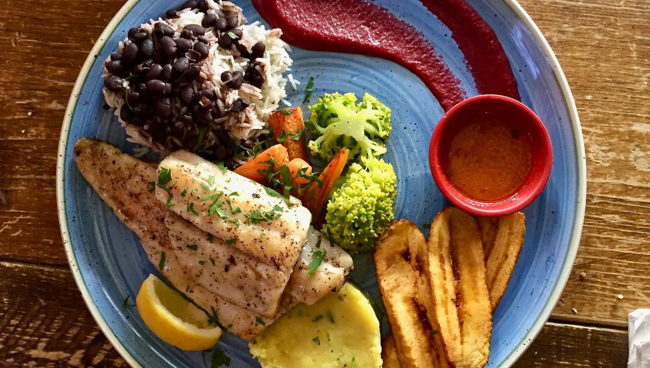 とってもカラフルなメイン料理。魚、プランテイン、豆ごはん、ビートルート・ピューレ、ポテト・マッシュなど、栄養バランスも抜群。丁寧な調理で大変美味しいです♪