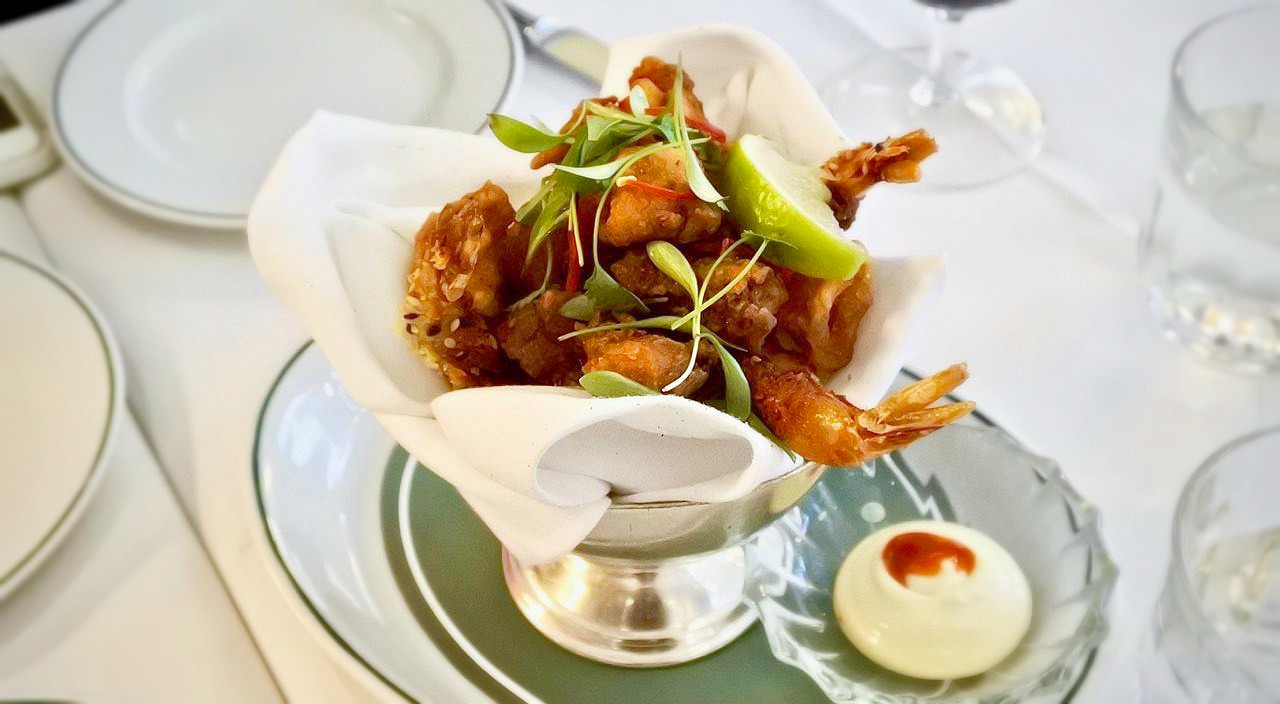 エビの天ぷら! 右は焼きたてのように温かいハウス・ブレッド。アイビー・マークの布ナプキンも上品です。
