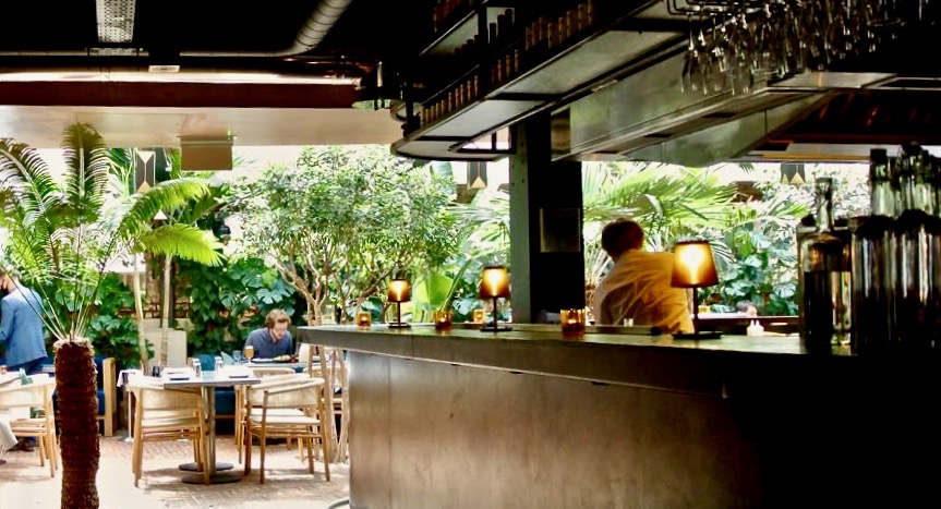 お店に入るとサニタリージェルで手を消毒し、テーブルまではマスクを付けて移動。持っていない場合はお店が用意しているものも使えるので安心です。素敵なバー・エリアを通り過ぎると・・・奥には緑したたるキラキラのコンサーバトリーが♪ このスペースの開放感と気持ち良さは実際に訪れてみないとわからないかもしれませんが・・・今の季節、最高の食事スペースと言っていいかもしれません。