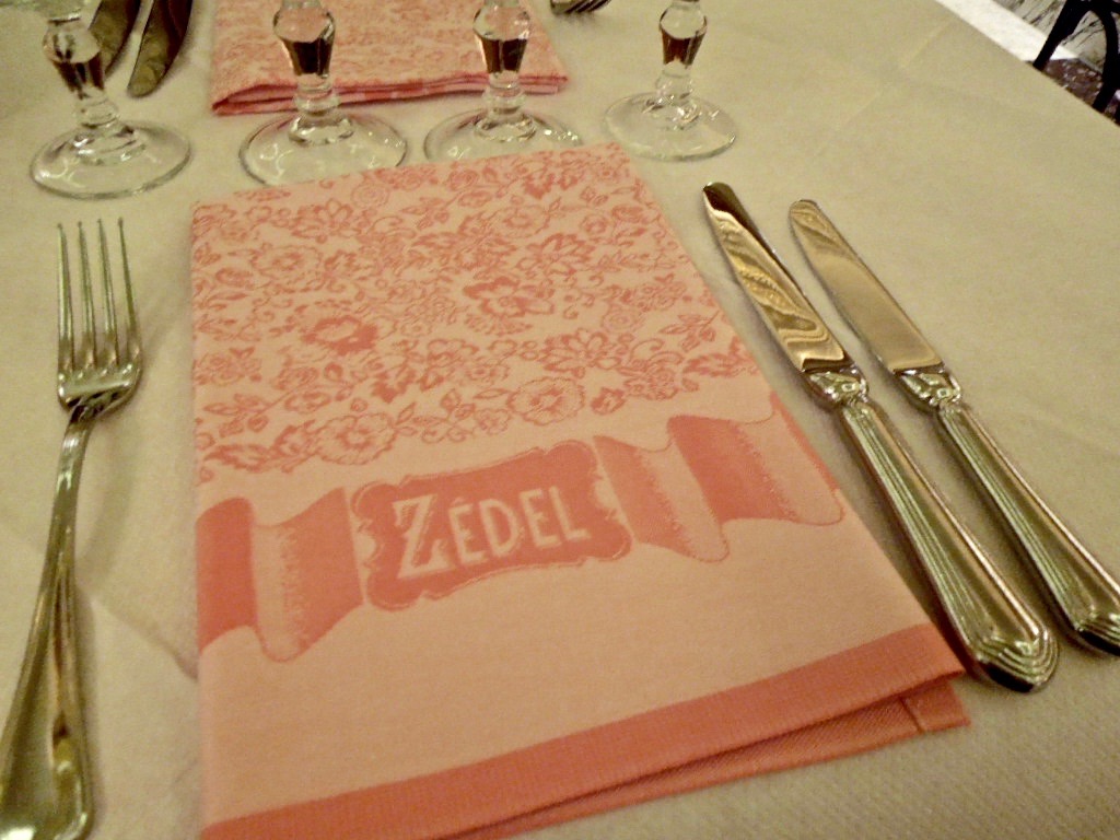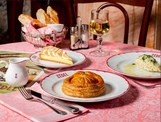 ビルのエントランスを入るとカフェがあり、階段を降りていくとシアターのような設えになったホールを中心にブラッセリーやバー、キャバレー・シアターへの入り口があります。ゼデルの入り口を一歩入るとそのゴージャスさに圧倒されそうになりますが、料理のお値段のほうはかなりリーズナブル。メニューを見るとエスカルゴ、フォアグラのパテ、鴨肉のコンフィから牛肉の赤ワイン煮まで、クラシックなフランス料理のオンパレードにお目見えします。