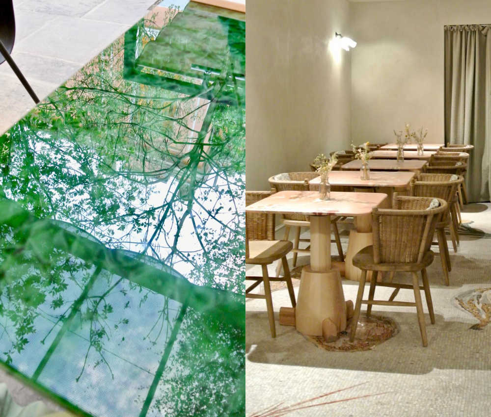 周囲の緑を反映させるためか、樹々のグリーンをイメージしたガラス製のテーブル・トップで統一されていて、ため息が出ます。現に周囲の樹木のシルエットも取り込み、秀逸なデザインだなーと、お料理もさることながら空間の素晴らしさに没入することに忙しいディナー・タイムでした^^