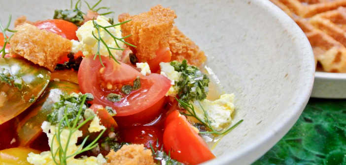 ポテト入り発酵生地のワッフル+オニオン&マッシュルーム・パフェ。