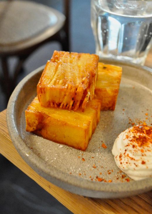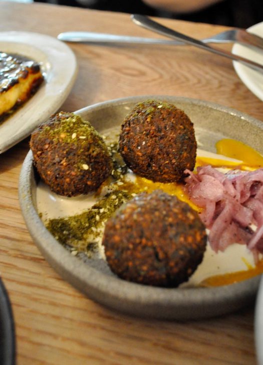 締めはタヒーニ入りグリーン・ファラフェルと、美しい佇まいのコンフィ・ポテトで。いく層にもなったコンフィ・ポテトはロンドンでもよく見かけるようになったレストランらしい一品ですが、たまに見掛け倒しのものもある中で、このお店のものはトップ3に入る美味しさでした。締めを飾るにふさわしい一品。