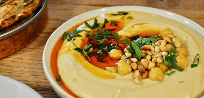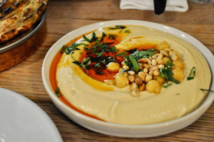少しずつの量なのかと思いきや、まず登場したフモス+焦がしバターと、ラブネ(ギリシャ風ヨーグルト)+コンフィ・ガーリックの量がショッキング! イラク風のフラット・ブレッドも炭火で香ばしくグリルしてあり、これだけでもうお腹いっぱいになりそうw