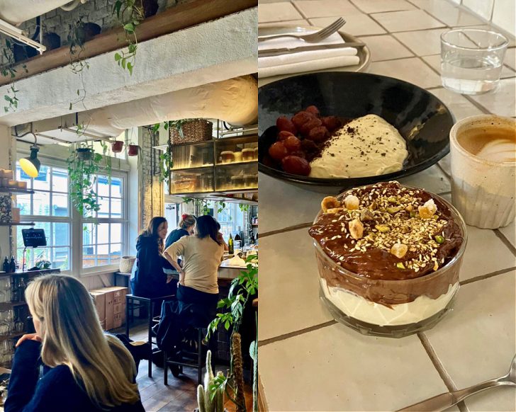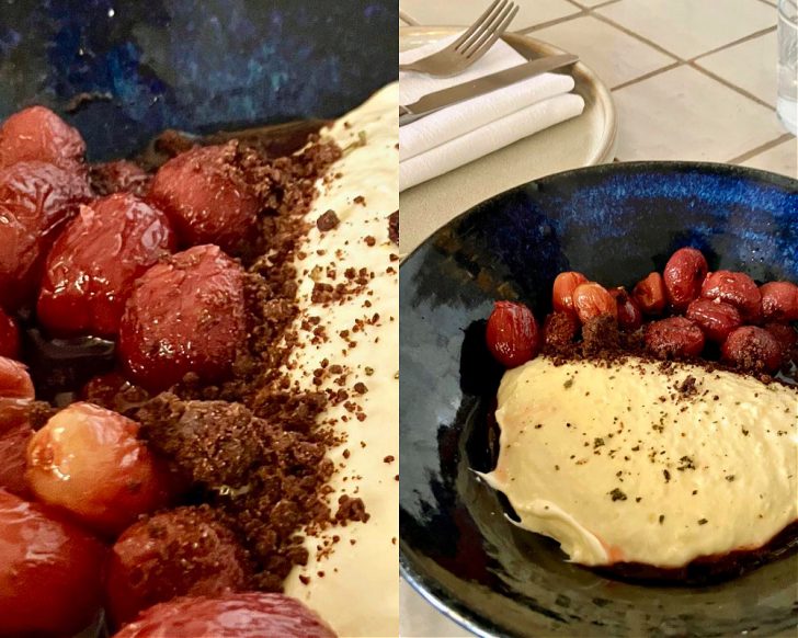 手前はなめらかなチョコレート・タヒーニのデザート。奥に見えているのはライス・プディング・パンナコッタ! 添えられているのはブドウのグリル、そして中東らしいスパイスのマハレブとココアニブをミックスしたもの。美味しいです♪ 甘すぎないので朝ごはんにもなりそう。