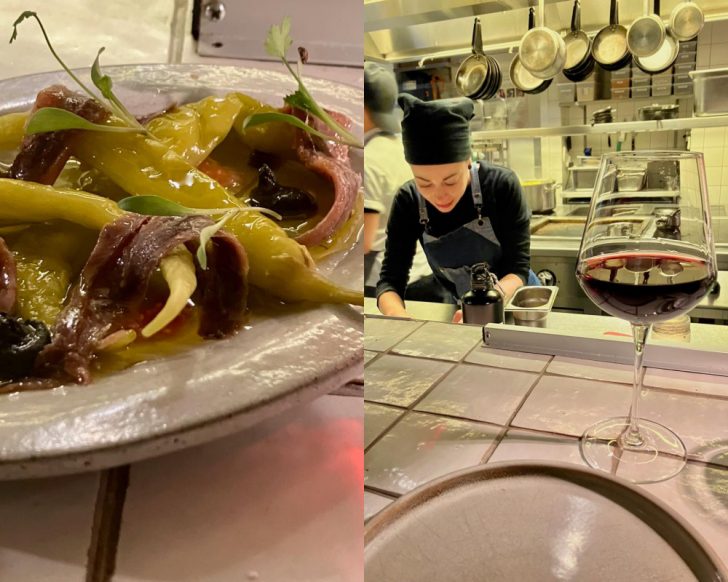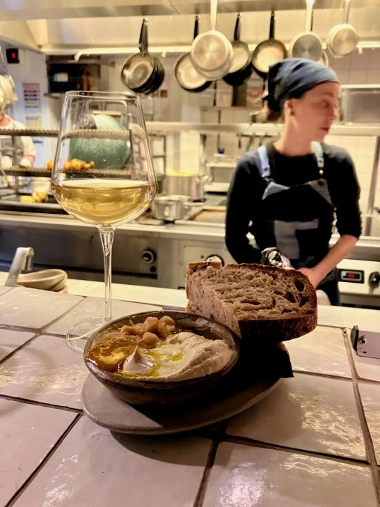 いやぁどれもハズレないですね。ヒヨコ豆のディップ、フムスは中東の胡麻ペーストであるタヒーニの量が多めでたっぷり。口どけ滑らかなそれを厚切りサワードゥブレッドと一緒にいただきます♪ アンチョビを唐辛子のピクルスと一緒にいただくのはバスク風なのですって。バスク料理に詳しい連れの友人が教えてくれました。