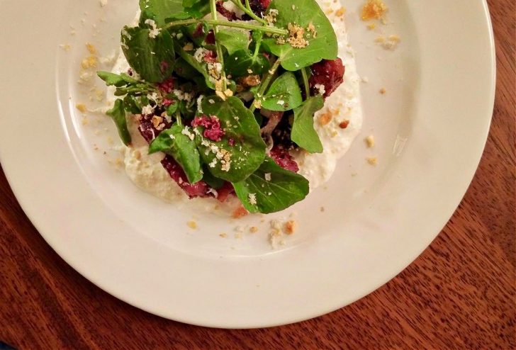 まずは前菜。ビーツのサラダ、ホースラディッシュ・ソースのフレッシュ・サラダ。4人全員が皆がこれを注文しました。