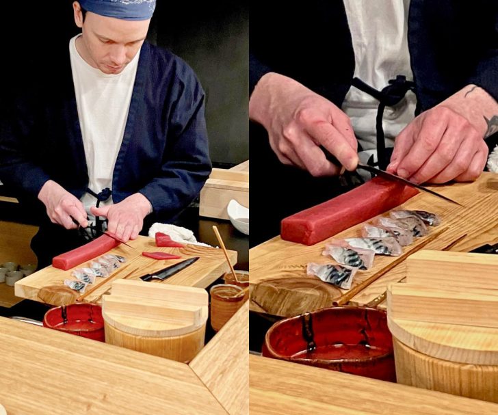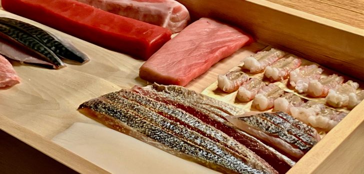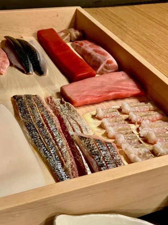 職人さんがおろす新鮮な魚介をゆっくり堪能しているところへ、本日のお寿司に使われる宝石のような生魚が、おもむろにお披露目〜。この美しさとクオリティが、お寿司の命ですね・・