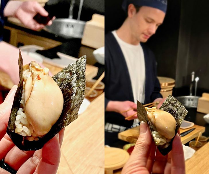 鮨の大トリを飾った牡蠣ですが・・・それまで食べたことのない美味しさでした。特製だれに漬けた牡蠣のお鮨。牡蠣本来の旨味のようなものを閉じ込めたスペシャルな一カン。ジュワッと口の中に洗練された美味しさが広がります。うう、いつかまた食べたい。