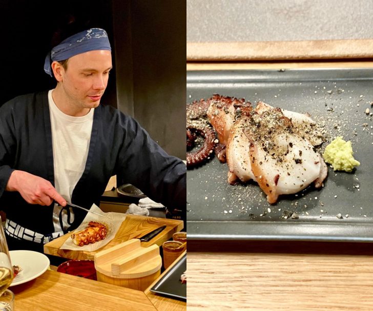 そして、タコは日本風です。スペイン料理などの柔らかタコを食べ慣れていると、この日本の寿司タコがなかなか噛みきれなくなってくるのですが(笑)、寿司通なら必ず「タコはこうでなくちゃ」と言う、そのままの正統派。自家製の胡麻ふりかけとわさびでいただきます♪