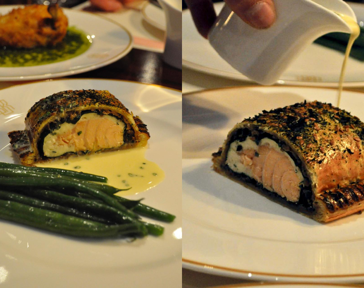 今回はスコットランド産サーモンのアン・クルート(パイ包み)を♪ 白く見えている部分は、ホタテのムース、黒い部分はマッシュルーム。シャンパンのホワイト・バター・ソースでいただきます。