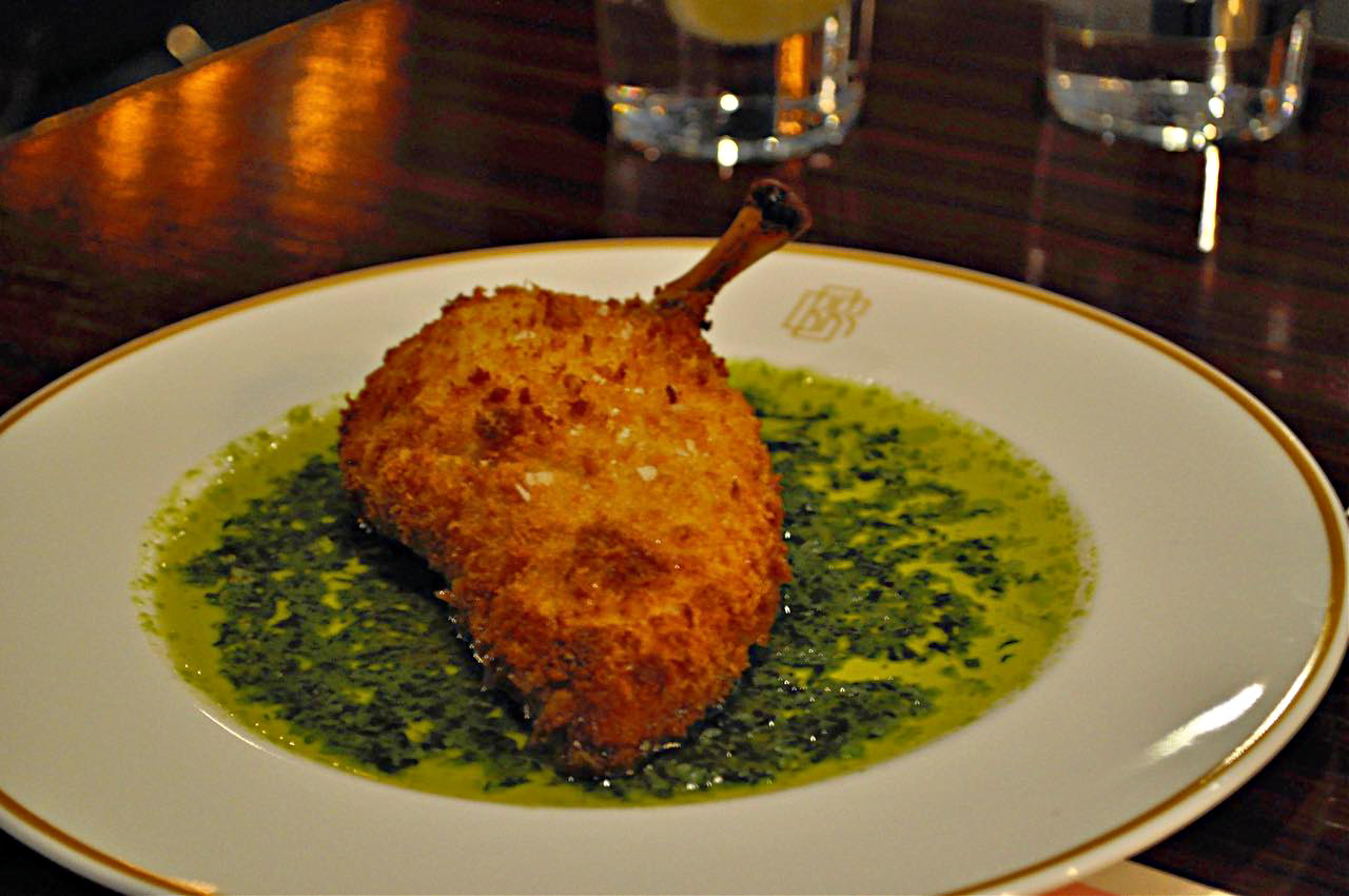 そしてウクライナの首都、キエフ名物の「チキン・キエフ」もシグニチャーとのことだったので、お願いしてみました。こちらはバター・ソースを包み込む通常のスタイルではなく、ソースは外側に。さっぱりとした鶏の胸肉を、ガーリック風味の春らしいグリーンのソースでいただくシンプルな一皿。フレッシュなサラダを副菜で添えてバランスを整えたいボリューム満点のメイン・コースです。
