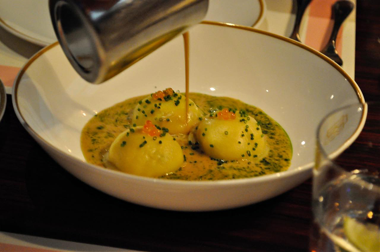 こちらは蟹やホタテ、海老などを包んだ自慢のペリメニ。ランゴスティンのビスクでいただくご馳走です♪ 甲殻類の旨味をしっかり感じられる一品で、大変美味しかった。日本人が好きそうなお味。