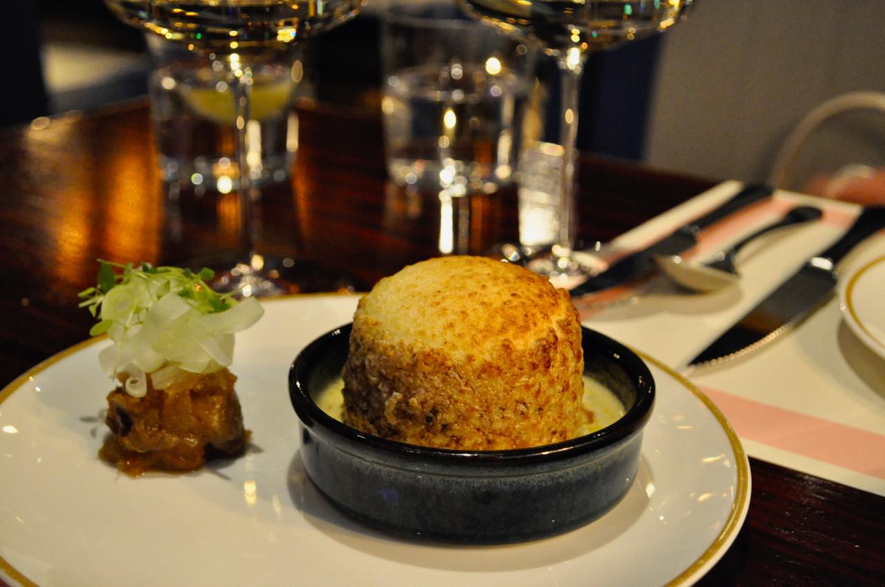 公称フレンチだけあり、もちろんフランス料理のエッセンスもそこかしこに。こちらは2度ベイクしながらも滑らかに仕上がっている濃厚なチーズスフレ♡ Stinking Bishopという英国産のチーズを使っているのですが、ソースにフランス産のコンテ・チーズを忍ばせるというニクい演出。添えられているのはリンゴと洋ナシ、ジンジャーのチャツネ。これがスフレに本当によく合う。チーズにチャツネを添えている感覚ですね。英仏の素敵な融合例で、シェフのセンスを感じます。(デザートとしてもいただけるようです)