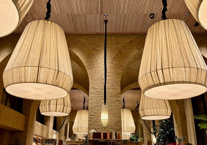 そして! 中に入ってまたまたびっくり。内装も大迫力! 巨大なランプシェードが高い天井から釣り下がり、伝統のレンガ作りのシンプルな空間にダイナミズムをもたらしています。大きな空間だけに温かみが必要ですが、そこはインテリア・デザイナー氏が巧みに暖色のナチュラル・カラーを配して落ち着きのある華やぎ空間を創り出しています。