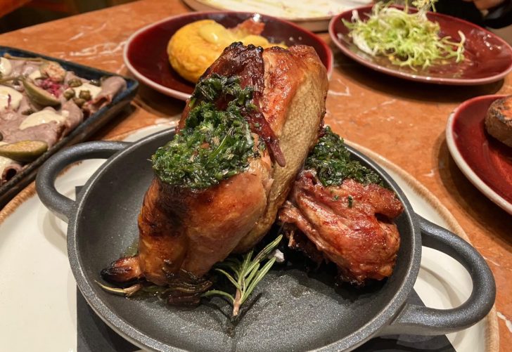 主菜としていただける料理には、炭火グリルのロティサリー料理、そして各種パエリアがあります。私たちはロティサリーでじっくり火を通した若鶏をいただいたのですが、ボリューム、お味、ともに満点。柔らかく、味わい深く、ハーブバター・ソースの伴奏も素晴らしい。
