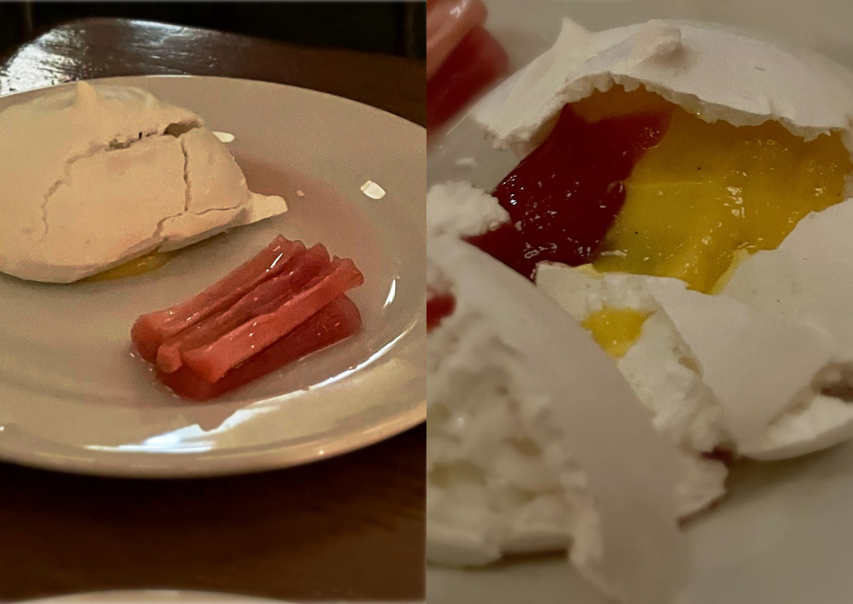季節のルバーブは、カスタードを包み込んだメレンゲと一緒に。手の込んだ一品。