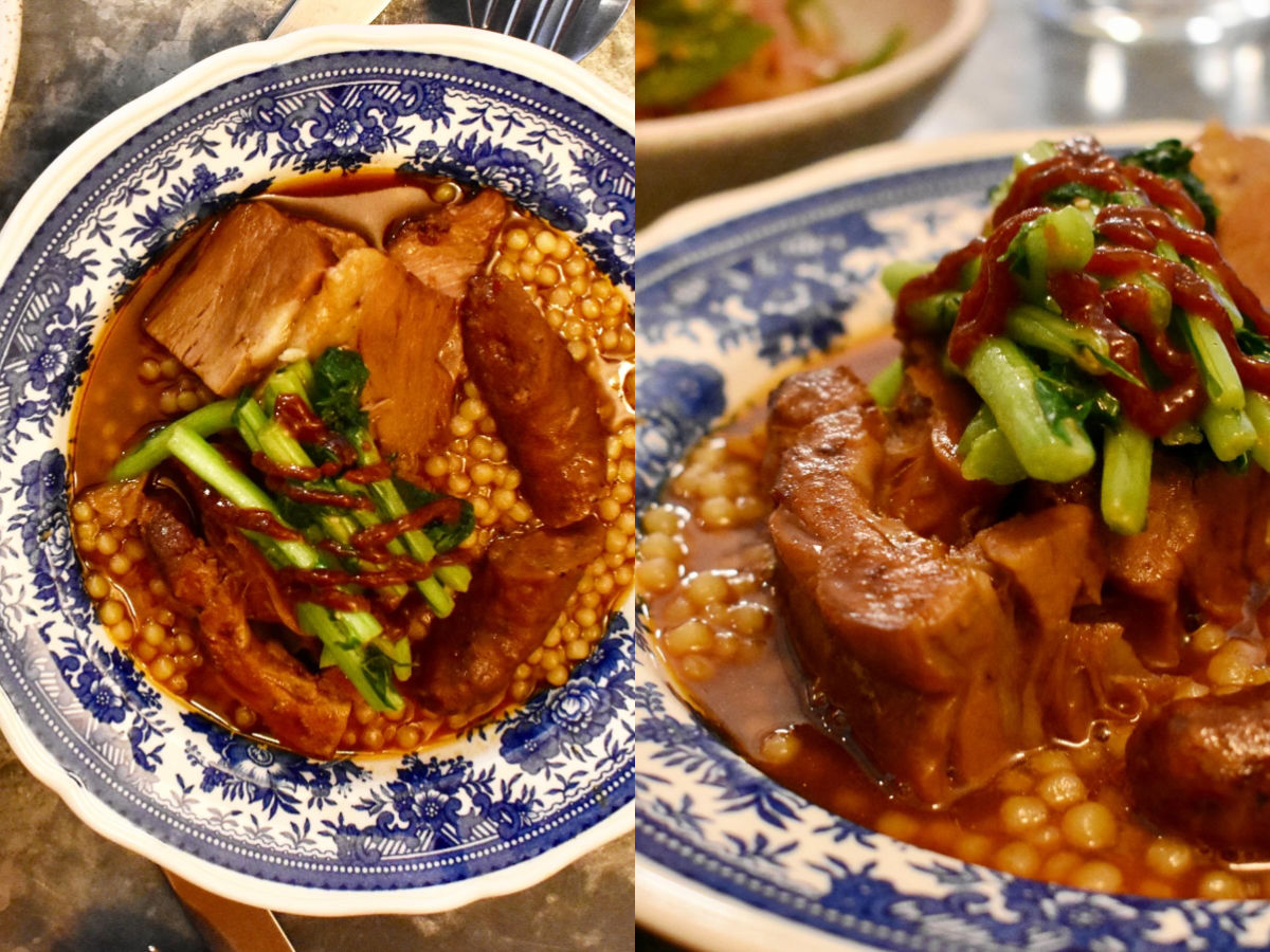 主菜として申し分なかったのは、ポークとソーセージの柔らか煮込み。フレグラと一緒に甘辛いソースでいただくお肉は完璧。グリーンも添えられ、甜麺醤風の甘いソースがアジア気分を盛り上げてくれました♡