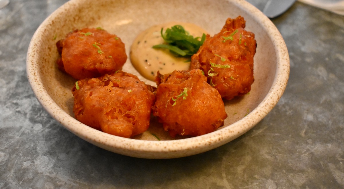 なにはともあれ、最初は定番のキムチ・フリッターからいきましょう! ほどよいキムチ味のさつま揚げ風フリッターに、チリマヨを少しだけつけていただくムチムチのおつまみ。あるようでロンドンではあまり見かけないスナックなのですが、なかなかクセになるお味です。問題なく完食♡