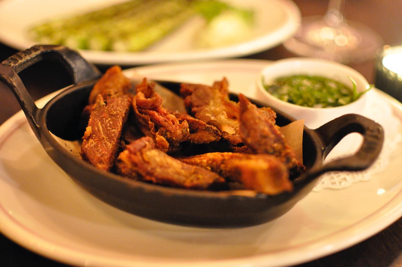 春はラム肉♪ これはラム・リブ! 骨から取って揚げてあるので、食べやすいのです。アンチョビ入りのソレル風味ヨーグルトで油を中和。
