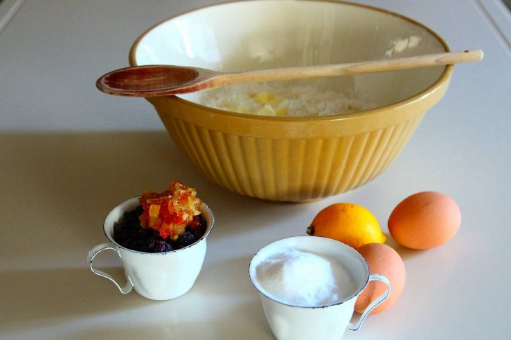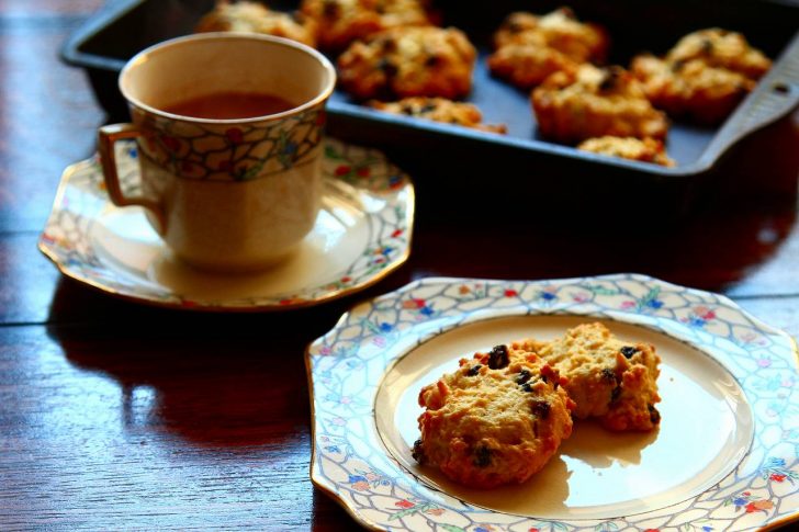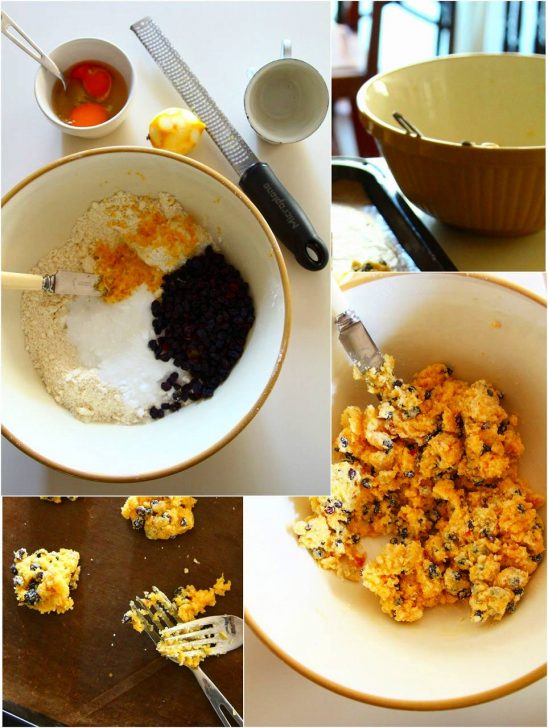1パウンドの小麦粉に6オンスのバターを加えてサラサラのパン粉状にし、半パウンドのお砂糖と6オンスのカランツ、2オンスのオレンジピール、レモンの皮のすりおろし1つ分、卵4個を加えてまとめます。これをフォーク2本を使って、粉をふった天板に、2インチずつ間隔をとりながら、小さな山になるようにラフにおいていきます。160~170℃のオーブンで15~20分程、全体に薄い焼き色がつくまで焼きましょう