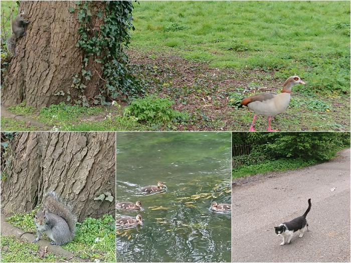 散歩中は植物だけでなくかわいい動物や鳥たちとの出会いもあってとても心が和みます。カモに追われて逃げるリスを見つけたり、カモの赤ちゃんの成長ぶりを毎日眺めたり、いつも見かける猫と仲良くなったり。