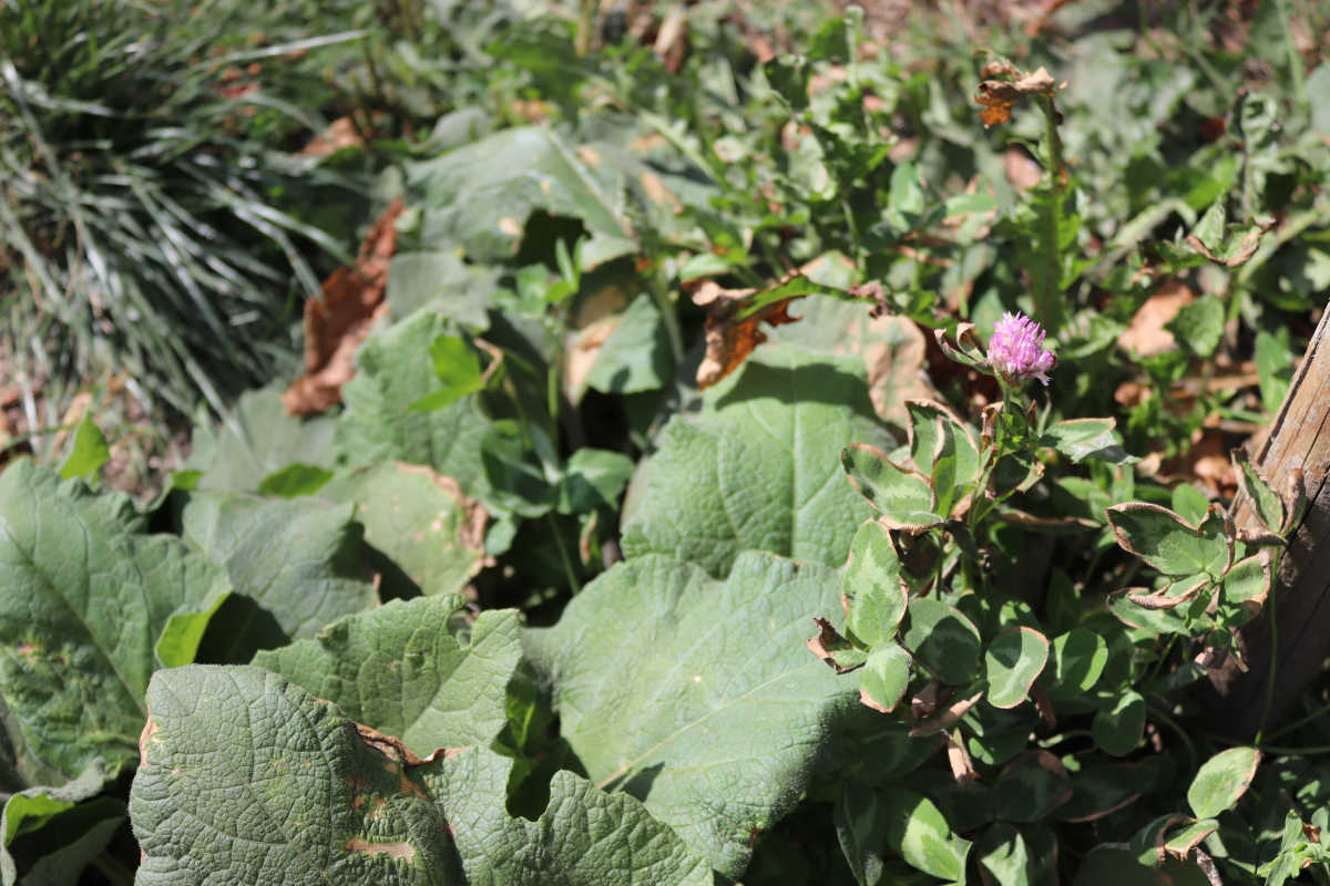 Burdock and Red clover:ハーブの血液浄化剤と言われるバードック(左)とレッドクローバー(右:ピンク色の花をつけている)が隣同士で自生