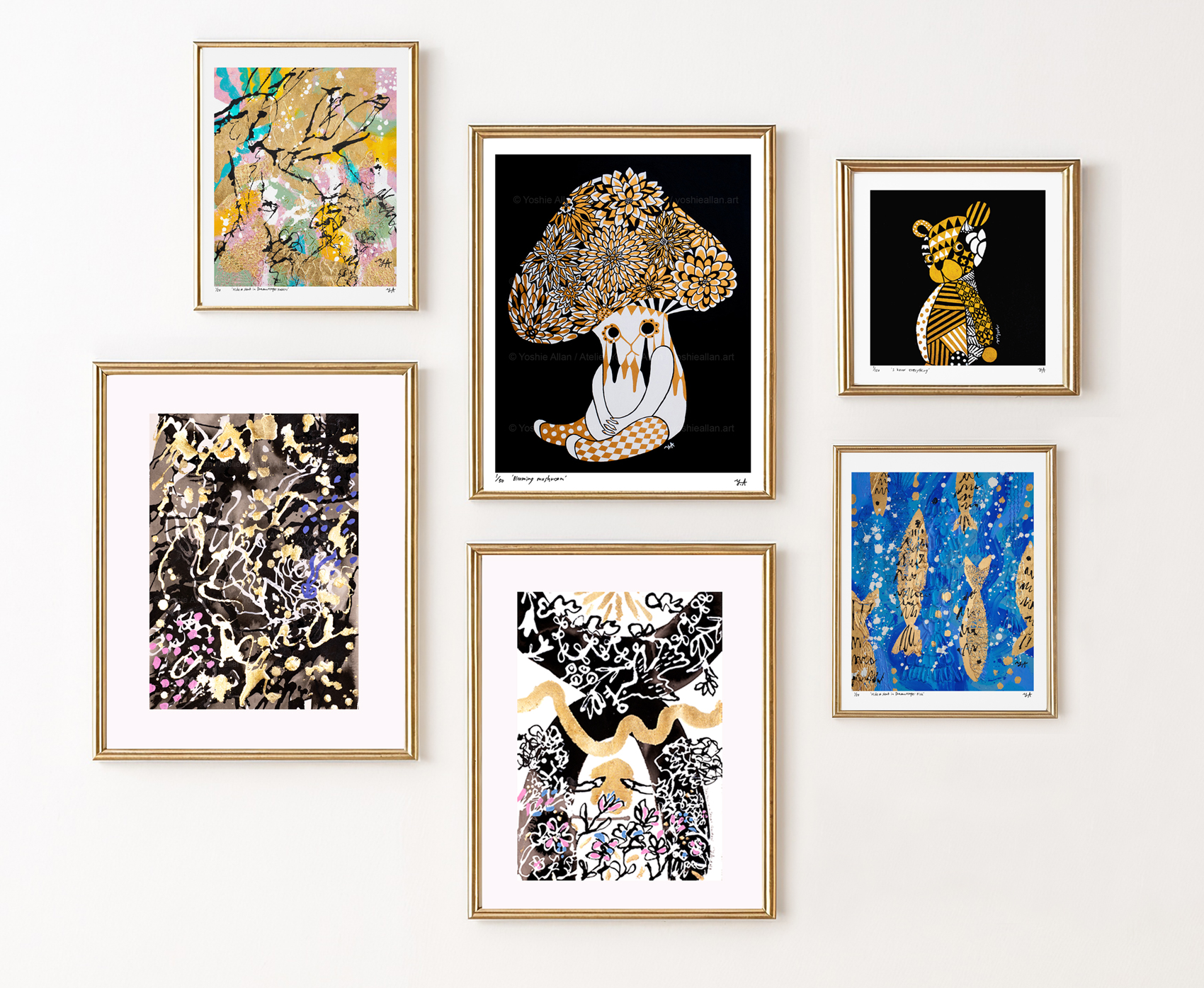 オリジナルのアート作品やプリントが好きな方は、よかったら、ヨシエのアーティスト・オンラインショップも覗いてみてください。白黒金がベースの絵から、色とりどりのかくれんぼアート、依頼主さんとセミコラボでつくるオーダーメイドのファブリック・ドールや、ペット・ポートレートなど、いろいろありますよ。