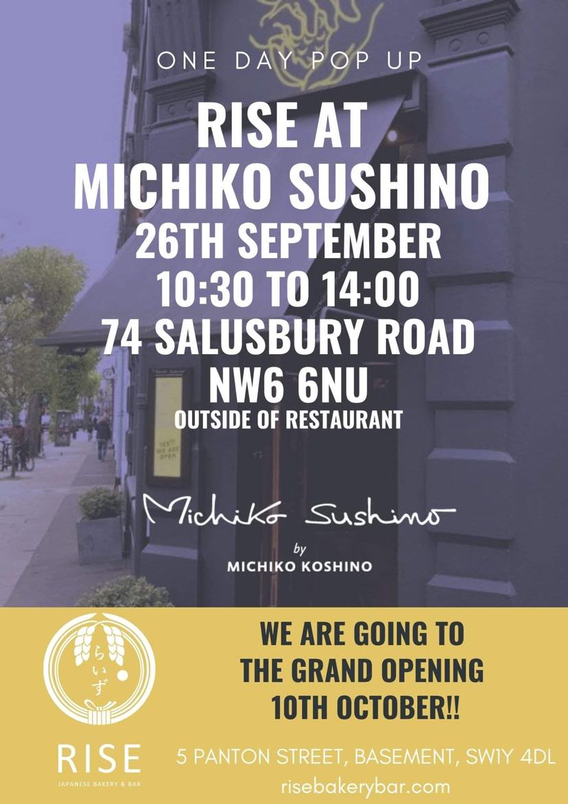 場所はQueens Park。デザイナーのMichiko KoshinoさんがオーナーのMichiko Sushinoの屋外スペースを使わせていただき、RISEのパンを販売します。日曜日はここのレストランの向かいではファーマーズマーケットも開催されています。10時から14時の4時間のみ!こちらも是非是非のお越しを!