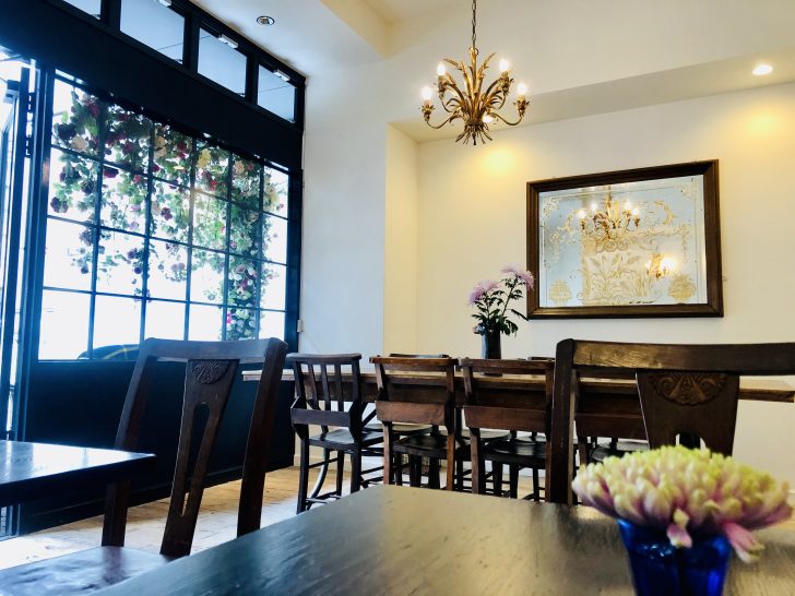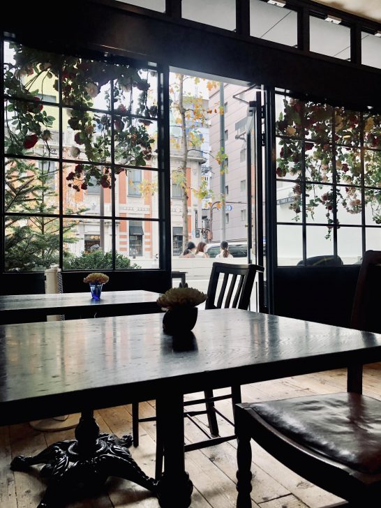 ここにずっと座って、ティールームの大きな窓の向こうに目をやると、洋館のカフェ&セレクトショップ「DEAN &DELUCA」が見えました。烏丸通りを忙しく行き交う車や自転車、人の波が、なんとなくロンドンの街にいるかのような気分になってきます。じゃあ反対に通りからこのティールームを見てみると、大きな窓の向こうのあたたかいシャンデリアの光の中でお茶をいただいている光景は、ロンドンのティールームに腰掛けているかのように見えるかもしれません。