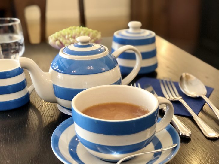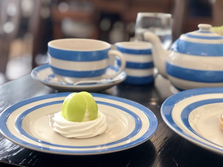今日の私のティーウェアはコーニッシュウェア。イングランド南西部にあるコーンウォール地方の海をモチーフとした、爽やかな太めのブルーストライプが印象的です。私の斜め前に座られたご婦人方は英国バーレイ社のブラックウィロー。ご婦人のお一人がバーレイ社の食器コレクターだとか。「ここはイギリスよね〜」と楽しそうなお話が聞こえてまいりました。バーレイを存分に堪能できる時間もここでは過ごせます。